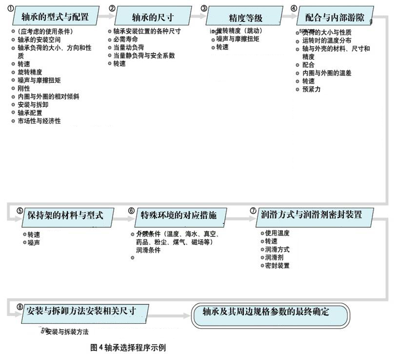 圖4為一般的軸承選擇程序和應(yīng)考慮的使用條件。但非一定要遵循規(guī)定的程序,而是應(yīng)該使最重要的性能要求得到滿足。